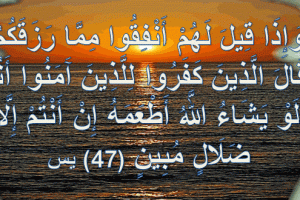 وَإِذَا قِيلَ لَهُمْ أَنفِقُوا۟ مِمَّا رَزَقَكُمُ ٱللَّهُ قَالَ ٱلَّذِينَ كَفَرُوا۟ لِلَّذِينَ ءَامَنُوٓا۟ أَنُطْعِمُ مَن لَّوْ يَشَآءُ ٱللَّهُ...