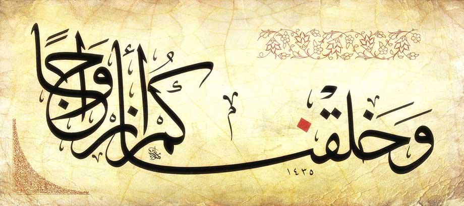 ‘അവന് നിങ്ങള്ക്ക് സ്വജാതിയില് നിന്നുതന്നെ ഇണകളെ സൃഷ്ടിച്ചുതന്നതും – അവരുടെ സാന്നിദ്ധ്യത്തില് നിങ്ങള് ശാന്തിനുകരാന്- നിങ്ങള്ക്കിടയില് സ്നേഹവും കാരുണ്യവും ഉണ്ടാക്കിത്തന്നതും അവന്റെ ദൃഷ്ടാന്തങ്ങളില് പെട്ടതാകുന്നു. തീര്ച്ചയായും ചിന്തിക്കുന്ന ജനതക്കിതില് ധാരാളം ദൃഷ്ടാന്തങ്ങളുണ്ട്. ‘ (30:21)