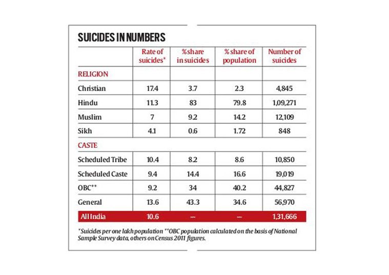 2014ലെ കണക്കുപ്രകാരം തയാറാക്കിയ രേഖ ഇതുവരെ പുറത്തുവിട്ടിരുന്നില്ല. ജാതി വിഭാഗത്തില്‍ ആദിവാസികളിലാണ് ഏറ്റവും കൂടുതല്‍ ആത്മഹത്യാ നിരക്കുള്ളത് 10.4 ശതമാനം, 9.4 ശതമാനവുമായി ദലിതുകളാണ് തൊട്ടുപിന്നില്‍. ഒ.ബി.സി വിഭാഗത്തിലും 9.2 ശതമാനം ആത്മഹത്യാ നിരക്കുണ്ട്. 2011ലെ സെന്‍സസ് പ്രകാരം 2.3 ശതമാനമാണ് രാജ്യത്തെ ക്രിസ്ത്യന്‍ ജനസംഖ്യ. എന്നാല്‍ അവരുടെ ആത്മഹത്യാ നിരക്ക് 3.7 ശതമാനമാണ്. 79.8 ശതമാനം ജനസംഖ്യയുള്ള ഹിന്ദുക്കളില്‍ നിരക്ക് 83 ശതമാനമാണ്. 14.2 ശതമാനം ജനസംഖ്യയുള്ള മുസ്‌ലിംകളില്‍ 9.2 ശതമാനവും.