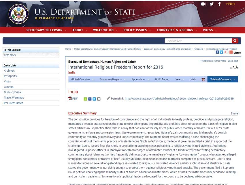 വാഷിങ്ടണ് : മതപരമായ അസഹിഷ്ണുതകളും ഗോ സംരക്ഷണത്തിന്റെ പേരിലുള്ള അക്രമസംഭവങ്ങളും ചൂണ്ടിക്കാട്ടി ഇന്ത്യയെ വിമര്ശിച്ചുകൊണ്ട് യുഎസ് സ്റ്റേറ്റ് ഡിപ്പാര്ട്ട്മെന്റിന്റെ വാര്ഷിക റിപ്പോര്ട്ട്. സ്റ്റേറ്റ് ഡിപ്പാര്ട്ട്മെന്റ് മത സ്വാതന്ത്ര്യത്തെക്കുറിച്ച് തയ്യാറാക്കിയ റിപ്പോര്ട്ടിലാണ് ഇന്ത്യയിലെ സാഹചര്യങ്ങളെക്കുറിച്ച് വിമര്ശമുള്ളത്. ദി ഇന്റര്നാഷണല് റിലീജ്യസ് ഫ്രീഡം റിപ്പോര്ട്ട് ഫോര് 2016 എന്ന പേരിലുള്ള റിപ്പോര്ട്ട് ചൊവ്വാഴ്ചയാണ് പുറത്തിറക്കിയത്.