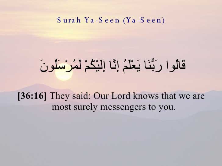 നേരത്തേ അവര് ഇക്കാര്യം ആ പട്ടണവാസികളോട് പറഞ്ഞിട്ടുള്ളതാണ്(യാസീന് 14). ഇവിടെ ഖുര്ആന് സൂക്തത്തില് ഒരു ‘ലാം'(ലാമുത്തൗകീദ്) കൂടുതല് വന്നിട്ടുള്ളതാണ് ഏക വ്യത്യാസം. വാസ്തവത്തില് ഇസ്ലാമികസന്ദേശത്തോടുള്ള ആശങ്കകലര്ന്ന പട്ടണവാസികളുടെ പ്രതികരണം ദൈവദൂതന്മാരുടെ അവകാശവാദത്തെ ഊട്ടിയുറപ്പിക്കാനേ സഹായിച്ചുള്ളൂ.